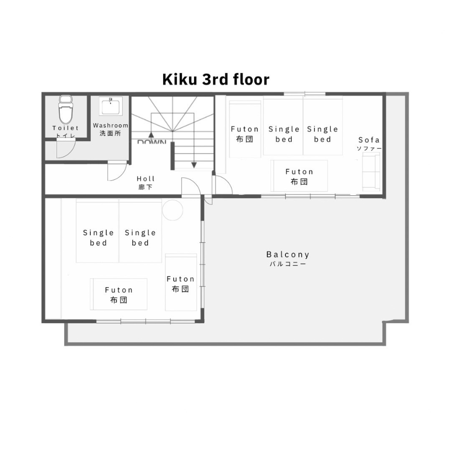 ベッドルーム3、リビング1、バスルーム2、トイレ2、バルコニー1 ベッドルーム1:シングルベッド2、布団2組